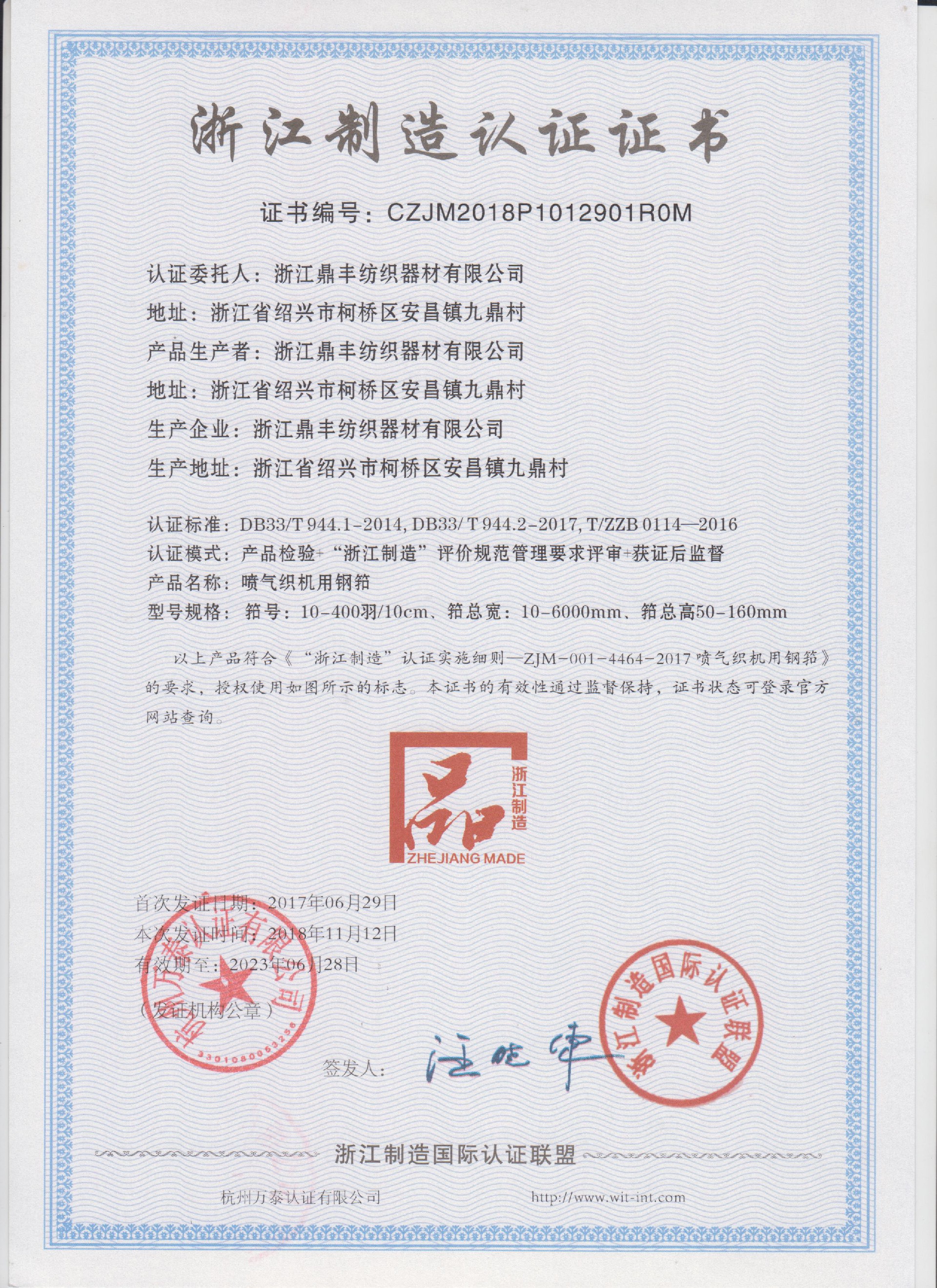 浙江鼎豐紡織器材有限公司始建于1986年,是一家專(zhuān)業(yè)生產(chǎn)各類(lèi)無(wú)梭織機(jī)用鋼筘:噴氣筘、噴水筘、劍桿筘、其他類(lèi)型鋼筘;鋁合金綜框、鋼片綜、停經(jīng)片、經(jīng)軸、織軸、卷布輥等產(chǎn)品及配件的民營(yíng)企業(yè)。